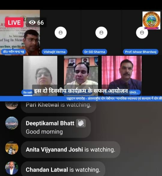 एसएसजे के योग एव विज्ञान विभाग की ओर से मानसिक स्वास्थ्य एवं कल्याण में योग की भूमिका पर दो दिवसीय अंतरराष्ट्रीय वेबिनार का शुरू हो गया है। शुक्रवार को वेबिनार का शुभारंभ मुख्य अतिथि उच्च शिक्षा मंत्री डॉ. धन सिंह रावत ने वर्चुअल माध्यम से किया। उन्होंने योग विज्ञान विभाग की ओर से समय-समय पर किए जा रहे ऐसे समाजोपयोगी कार्यक्रमों की सराहना की ।