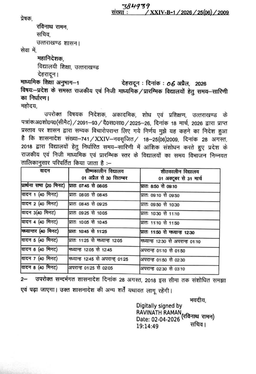 उत्तराखंड: उत्तराखंड शासन ने प्रदेश के समस्त राजकीय एवं निजी माध्यमिक और प्रारंभिक विद्यालयों के लिए नई समय-सारणी निर्धारित कर दी है।