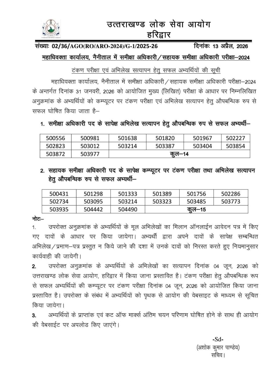 बीती 31 जनवरी, 2026 को मुख्य (लिखित) परीक्षा आयोजित हुई थी। जिसमें कुल 14 अभ्यर्थियों को अभिलेख सत्यापन के लिए औपबंधिक रूप से सफल घोषित किया गया है। कुल 15 अभ्यर्थियों को कंप्यूटर पर टंकण परीक्षा और अभिलेख सत्यापन के लिए सफल घोषित किया गया है। अभिलेख सत्यापन 04 जून, 2026 को उत्तराखंड लोक सेवा आयोग, हरिद्वार के कार्यालय में किया जाएगा। टंकण परीक्षा (ARO हेतु) कंप्यूटर पर टाइपिंग टेस्ट भी 04 जून, 2026 को ही आयोजित किया जाना प्रस्तावित है।