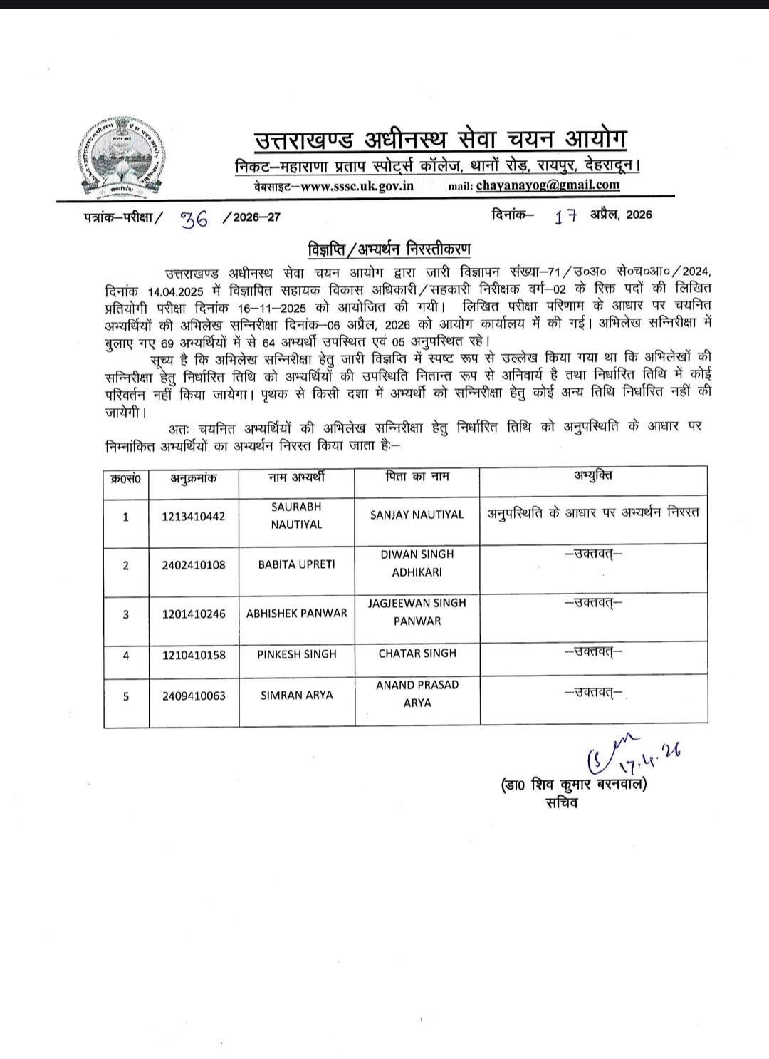 मीडिया रिपोर्ट्स के मुताबिक आयोग ने अभिलेख सत्यापन में अनुपस्थित रहने के कारण आयोग ने पांच अभ्यर्थियों का अभ्यर्थन तत्काल प्रभाव से निरस्त कर दिया है। आयोग के सचिव डॉ. शिव कुमार बरनवाल द्वारा जारी विज्ञप्ति के अनुसार, इन पदों के लिए लिखित प्रतियोगी परीक्षा 16 नवंबर 2025 को आयोजित की गई थी। परीक्षा परिणाम के आधार पर चयनित 69 अभ्यर्थियों को 6 अप्रैल 2026 को अभिलेखों की जांच के लिए आयोग कार्यालय बुलाया गया था। इस प्रक्रिया में 64 अभ्यर्थी उपस्थित हुए, जबकि 5 अभ्यर्थी अनुपस्थित रहे।